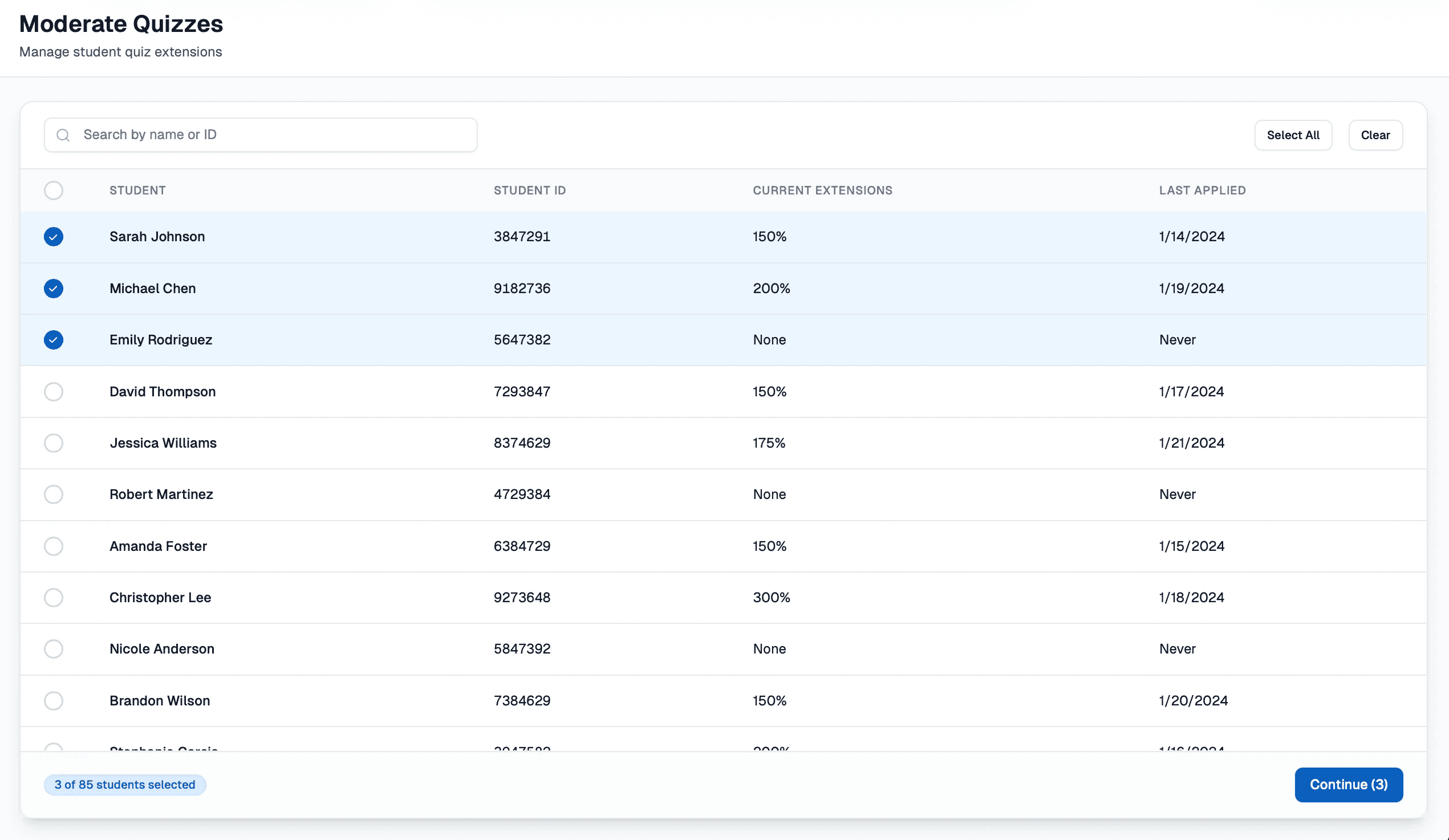 Goal: Enable instructors to quickly select groups of students and batch-apply time extensions while reducing errors and building confidence.